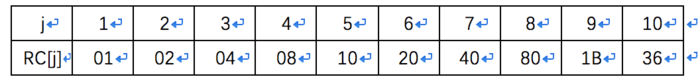 因为16字节密钥的只进行10轮的扩展,所以最后生成的RC[j]的值按16进制表示为: