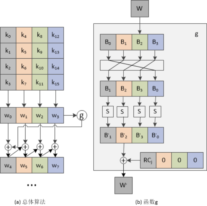 - 若j%4=0,则w[j]=w[j-4]⊕g(w[j-1]),否则w[j]=w[j-4]⊕w[j-1];