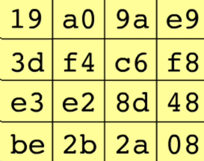 输入状态:是一个4×4的数组,数组内每个元素由输入的明文分组组成,按照列进行排序,比如输入的明文数据为193de3bea0f4e22b9ac68d2ae9f84808,则输入状态为