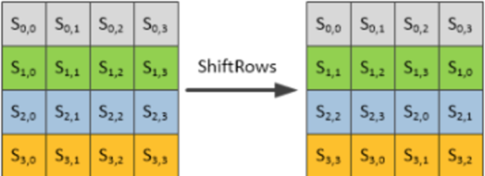 - 行移位:状态的第一行保持不变。第二行循环左移一个字节,第三行左移两个字节,第四行循环左移三个字节。