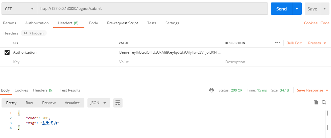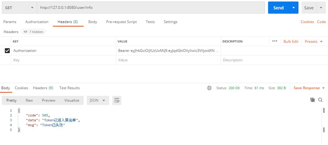 {"code":505,"data":"可能存在IP伪造风险","msg":"Token已过期"}- 登出,使用响应头中的新的Token