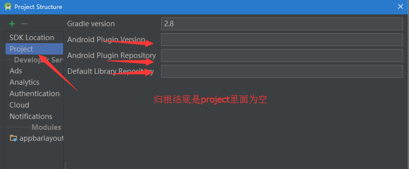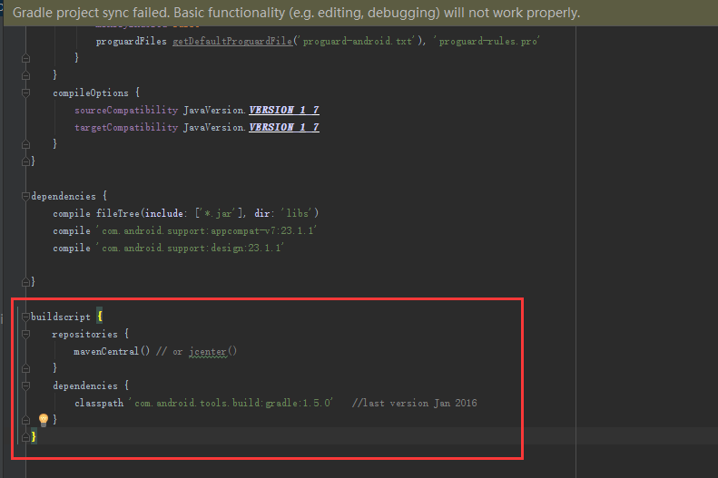 打开报错的项目的build.gradle,看看有没有buildscript{}(应该是没有的,因为就是没有这个东西才报错的
