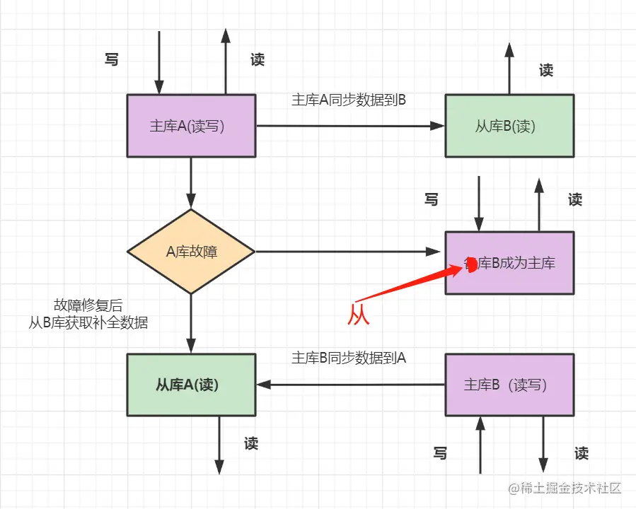 - 架构描述: 两台机器A和B,A为主库,负责读写,B为从库,负责读数据。如果A库发生故障,B库成为主库负责读写。修复故障后,A成为从库,主库B同步数据到从库A。