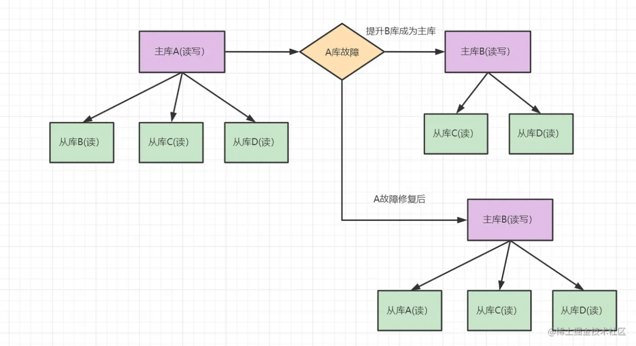 - 架构描述: 一台主库多台从库,A为主库,负责读写,B、C、D为从库,负责读数据。如果A库发生故障,B库成为主库负责读写,C、D负责读。修复故障后,A也成为从库,主库B同步数据到从库A。
