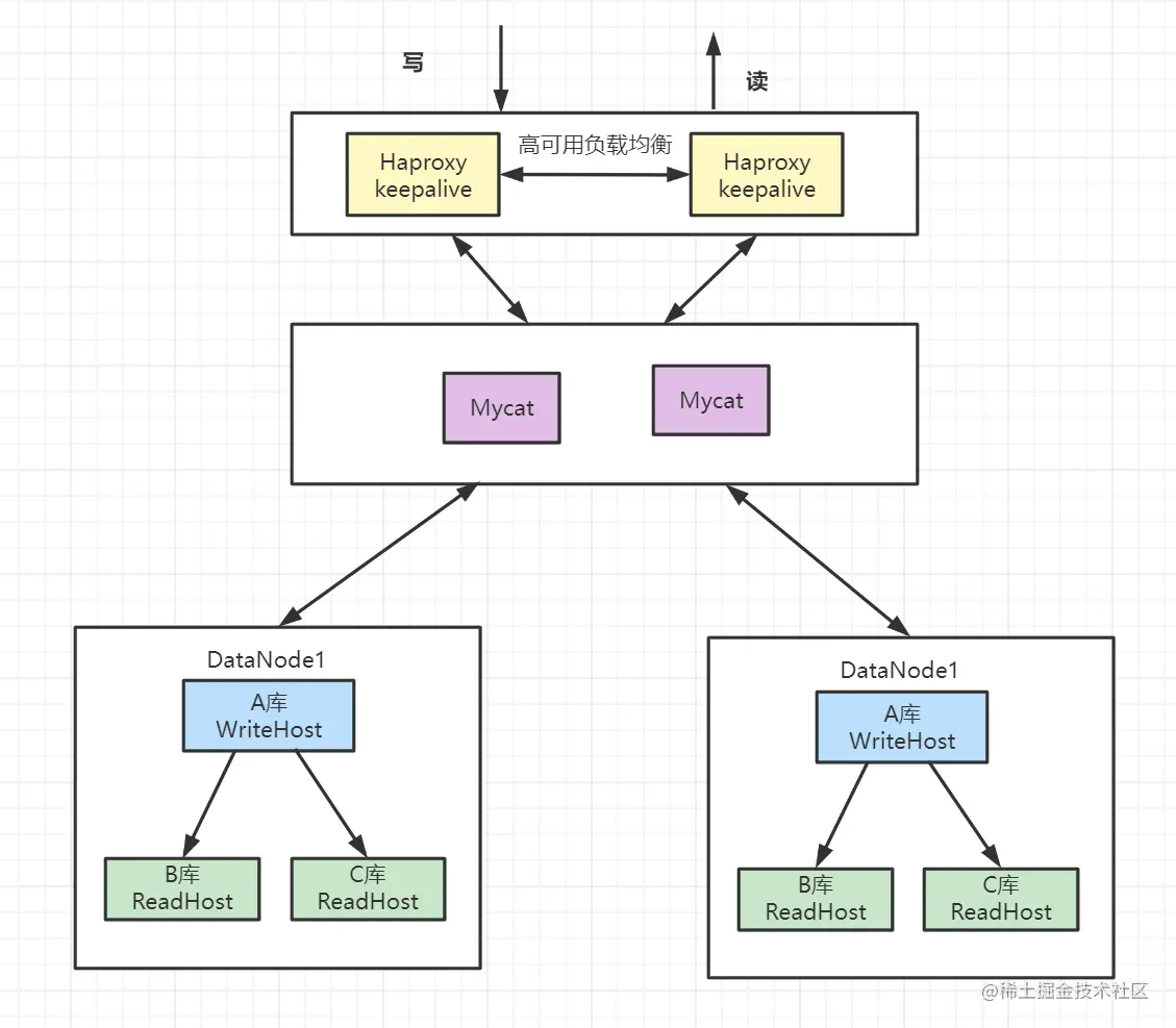 - 架构描述:mycat分片存储,每个分片配置一主多从的集群。