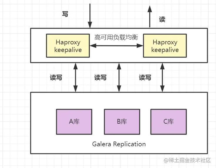 Galera Replication方法进行数据同步,每个库理论上数据是完全一致的。 - 优点: 读写的并发度都明显提升,可以任意节点读写,可以自动剔除故障节点,具有较高的可靠性。