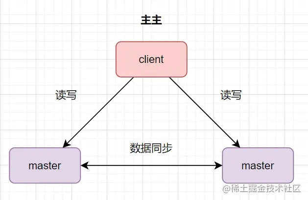 数据库主主:两台都是主数据库,同时对外提供读写操作。客户端访问任意一台。数据存在双向同步。