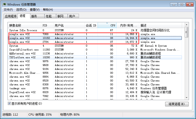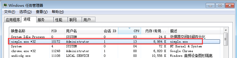 如图,同一个exe窗口程序多次重复打开之后其PID是唯一的,其他信息(名称)相同,所以首先拿到以CreateProcess方法创建子进程时的进程PID