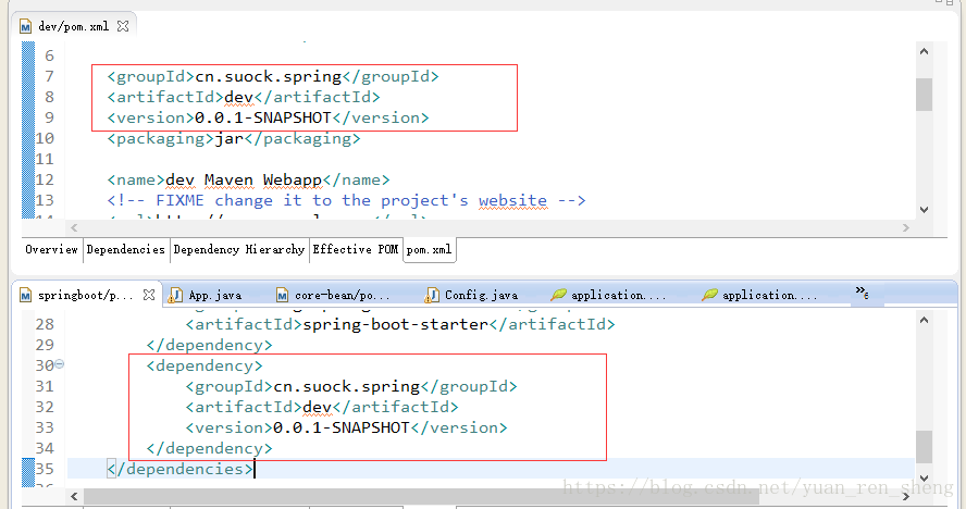 boot里面引用dev的坐标之后两个项目就有所关联了,现在我们引用dev里面的配置。有两种结果