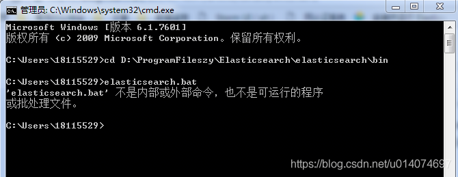 输入后 回车,提示错误'elasticsearch.bat不是内部命令或外部命令,也不是可运行的程序或批处理文件',