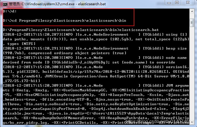 - cd 指定的目标路径,cd ProgramFileszy\Elasticsearch\elasticsearch\bin 回车