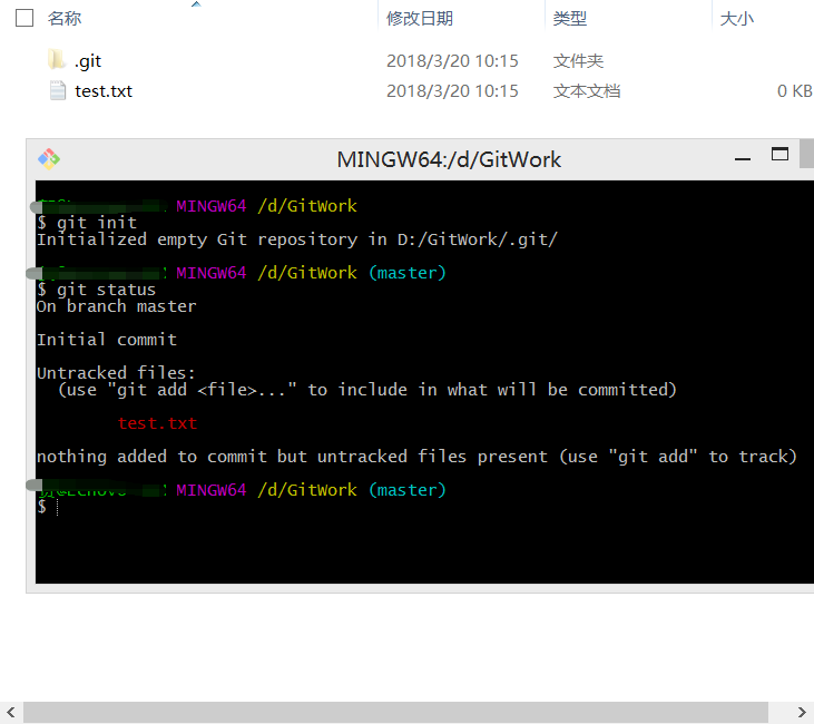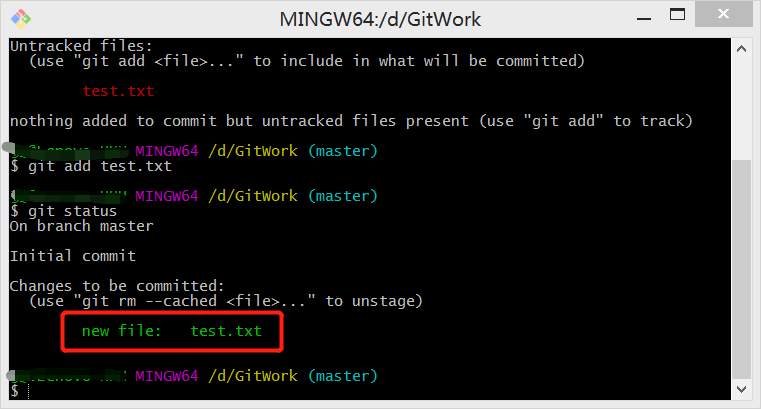 在本地创建一个test.txt文件,使用git status 查看文件的状态,发现是红色的,说明没有和仓库关联。