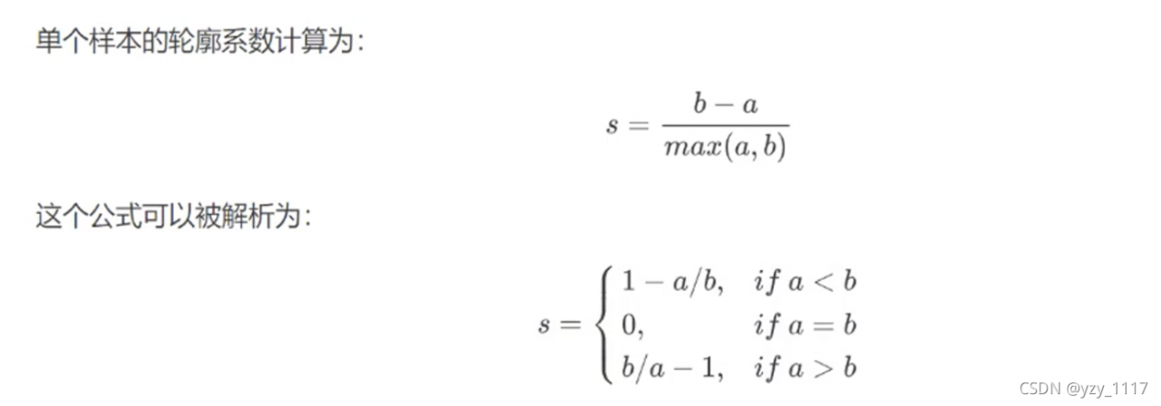 能够同时衡量 样本与其自身所在的簇中的其他样本的相似度a,等于样本与同一簇中所有其他点之间的平均距离; 样本与其他簇中的样本的相似度b,等于样本与下一个最近的簇中的所有点之间的平均距离。