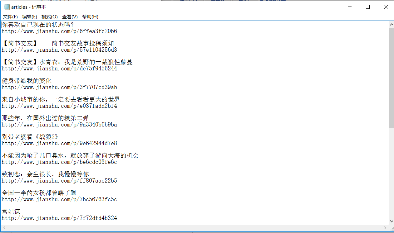 file.write("http://www.jianshu.com" + title.get('href')+'\n\n')