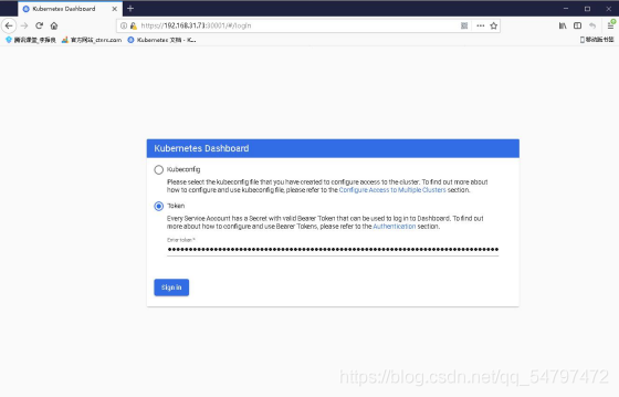 kubectl describe secrets -n kube-system $(kubectl -n kube-system get secret | awk '/dashboard-admin/{print $1}')使用输出的token登录Dashboard。