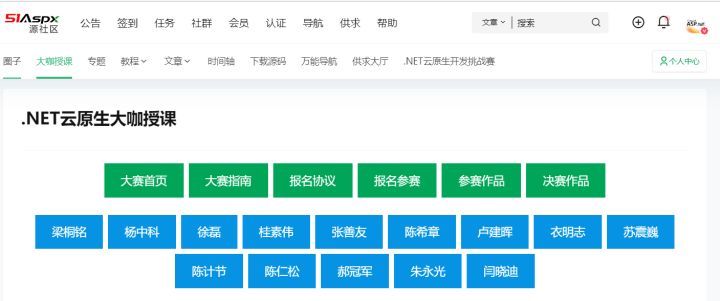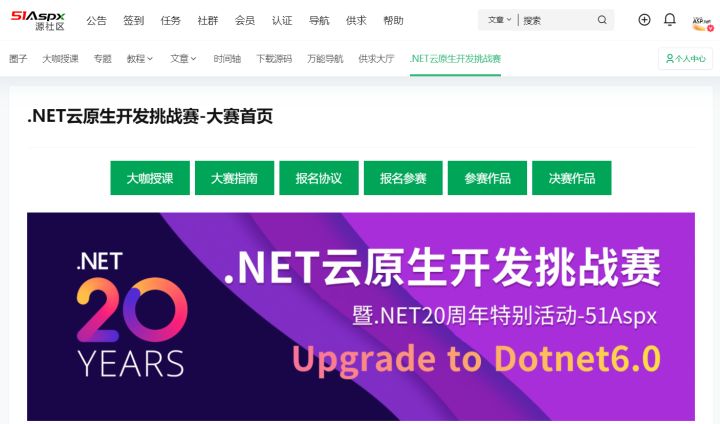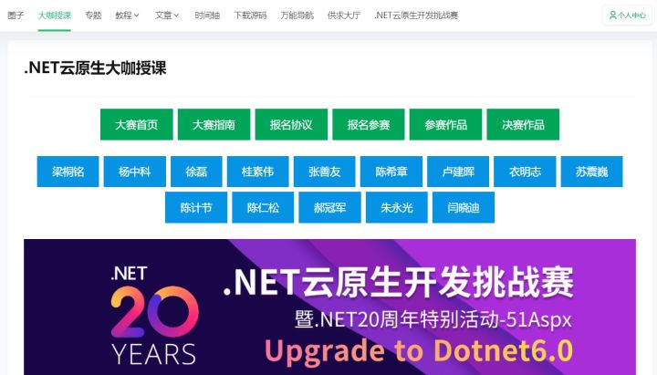 .NET云原生挑战赛圈子:2022年 .NET20周年之际 微软和51Aspx共同举办 .NET云原生挑战赛,以后每年都会举办一次赛事,本次大赛为公益性质,大赛奖金与奖品由,微软和51Aspx共同赞助,详细可查看大赛页面.NET云原生开发挑战赛-大赛首页 – 源社区,本次大赛,还衍生了大咖授课模块的建立.NET云原生大咖授课 – 源社区,以发文止,已经授课十三场,平均每周都会有大咖无私授课,为的就是.NET生态越来越好。
