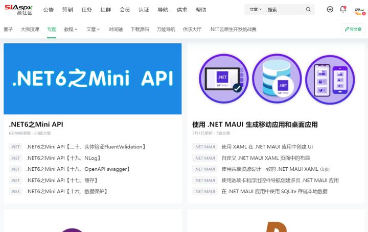 所以的技术都会收录到专题中,有成系列的技术文章,也有技术相关的技术文章,专题区分清晰,大专题包含小专题,让技术人可以很容易的找到相关的技术文章去阅读、去提升,同时邀请各位技术人分享自己的技术文章,比如:桂素伟老师就将他Mini API技术系列文章无私分享出来,我们也整理成了技术专题,以及电子书形式分享出来,方便大家阅读。