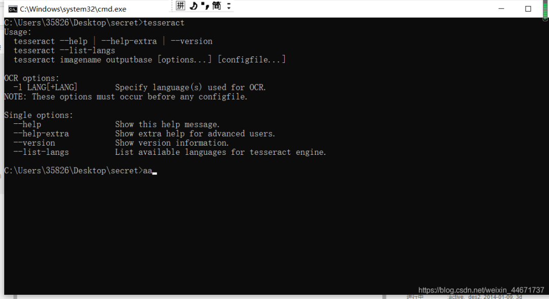1.tesseract + 图片路径 + 保存结果名 + -l 语言集
