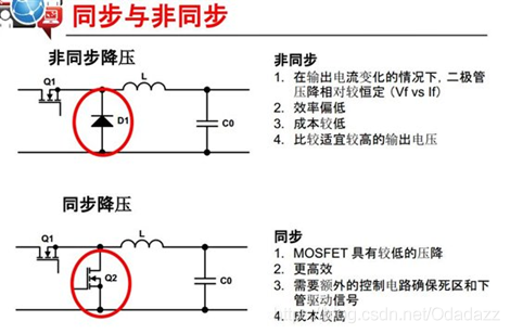 同步和异步的区别从外部来看,是多了一个有续流的二极管。其实BUCK的输出电流分成两个部分的,一个部分是来自电源,一个部分是来自异步电路中的这个二极管,只是同步电路把这个二极管用一个MOSFET给替代了,但是这个MOSFET的开关需要和Q1的MOSFET保持一定的相位关系,大家习惯把这样的关系叫做同步模式。同步比异步的好处就是拥有更快的导通速度,和更小的导通压降,因而效率回更高。二极管因为有固定的导通电压的存在,在越大的输出电压的时候,在这个二极管上面的供耗损失会越大。[Z2]