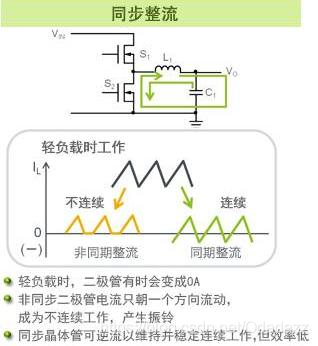 当负载较轻时,负载电流会很小,甚至会下降至零交叉级。在此状态下,异步整流方式,二极管会呈现断续工作,电流只能朝一个方向流动。此时的二极管的损耗反而降低了。但是由于工作在不连续模式,开关电压将发生振铃,产生高谐波噪声。而同步整流模式下,在MOSFET导通的情况下,电流会有两个方向的流动,此时的同步整流模式工作在连续模式,损耗不会减小。但是开关电压不会产生振铃。