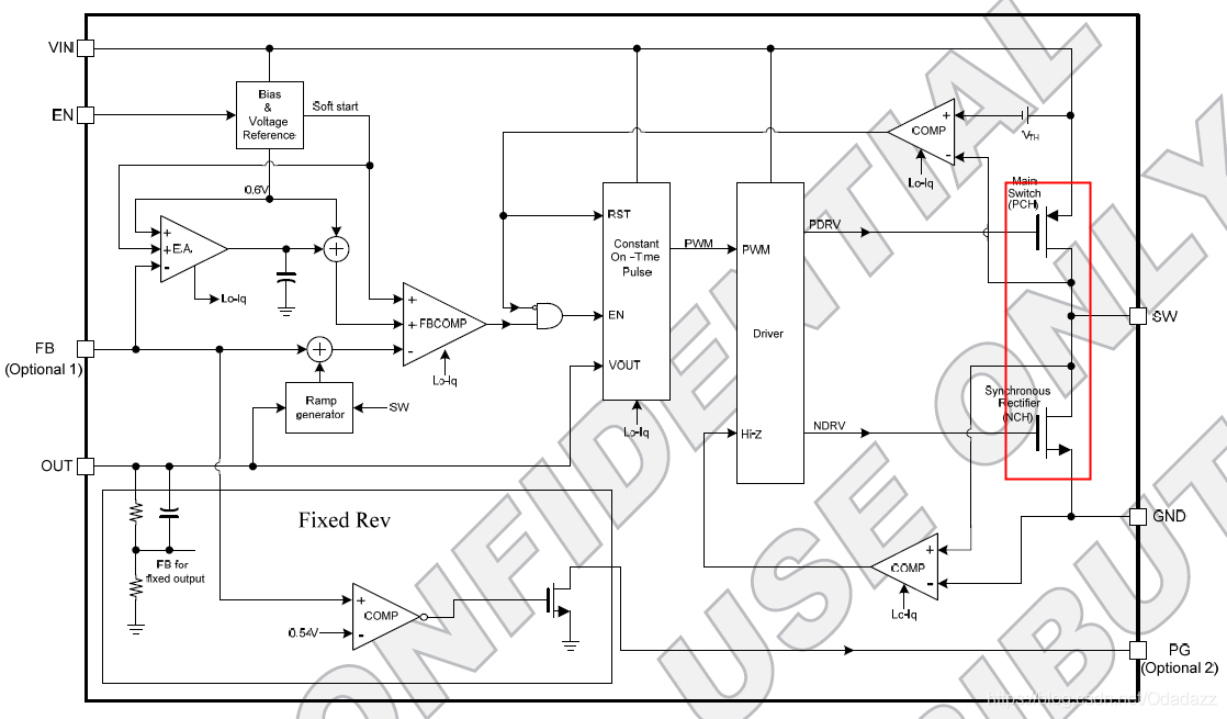 同步整流:通过内部框图判断,一般非同步整流内部只有上管,下管为肖特基二极管且为外接。