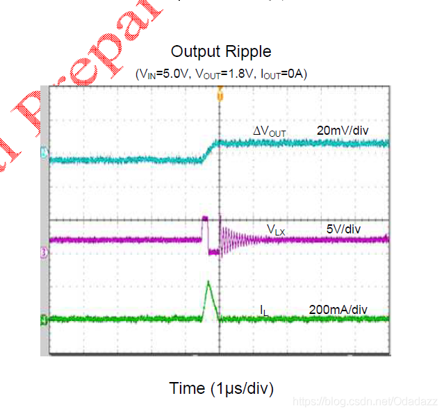 由前述的DCM模式可知,占空比D会随着负载电流的减小而减小,但是无法一直减小,因为BUCK控制器有最小导通时间限制,比如凌特的LTC3624芯片,这个时间为60ns左右,占空比D为6%。若负载电流继续减小,由于占空比D无法继续减小,则BUCK控制器会抛弃一些开关脉冲,即在一个开关脉冲的时间内,对输出电容充入足够的电荷,使电容能够在没有开关脉冲的时间段内,维持对输出负载的供电,PWM演变到PSM的过程波形如图2所示,LTC3624芯片的PSM波形如图3所示。相对于正常的PWM模式,PSM模式开关脉冲的频率大大降低。