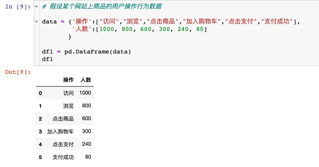 漏斗图在用户画像中运用的非常广,尤其是在电商领域中,从访问、浏览到最终的支付成功等一系列的操作构成一个漏斗,在这里我们模拟一份数据来绘制漏斗图,先生成一个模拟数据: