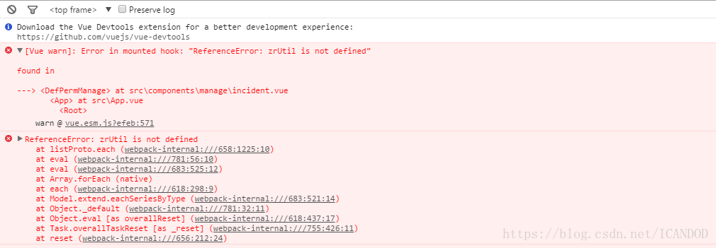在vue.js中集成echarts时,第一次打开页面出现以下异常: