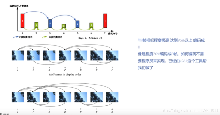 一般平均来说,I的压缩率是7(跟JPG差不多),P是20,B可以达到50,可见使用B帧能节省大量空间,节省出来的空间可以用来保存多一些I帧,这样在相同码率下,可以提供更好的画质。