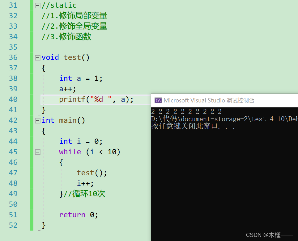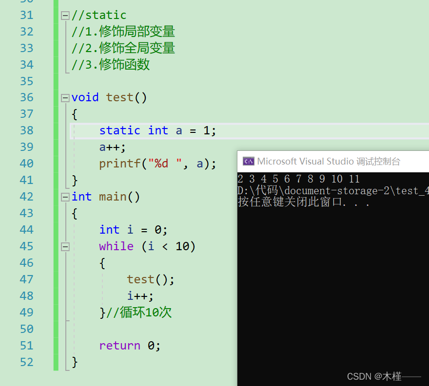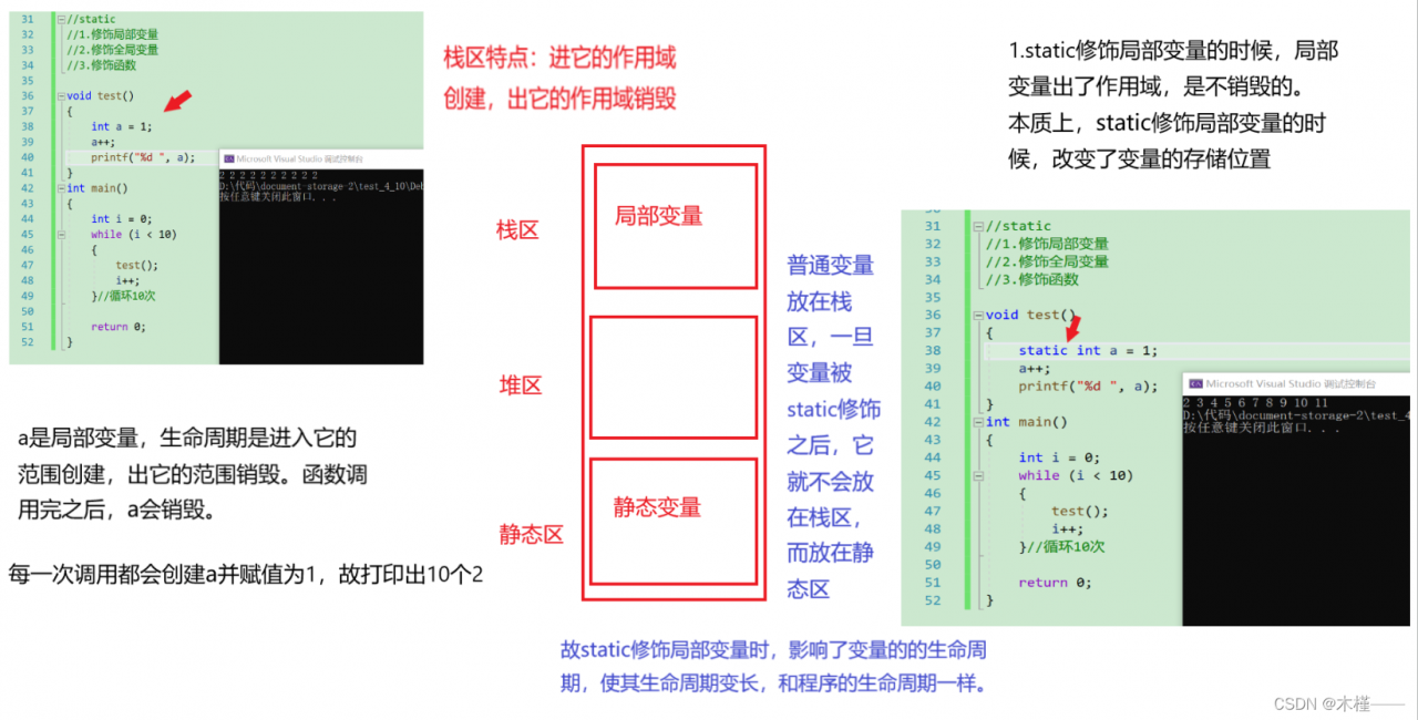 本质上,static修饰局部变量的时候,改变了变量的存储位置。static修饰局部变量时,影响了变量的的生命周期,使其生命周期变长,和程序的生命周期一样。