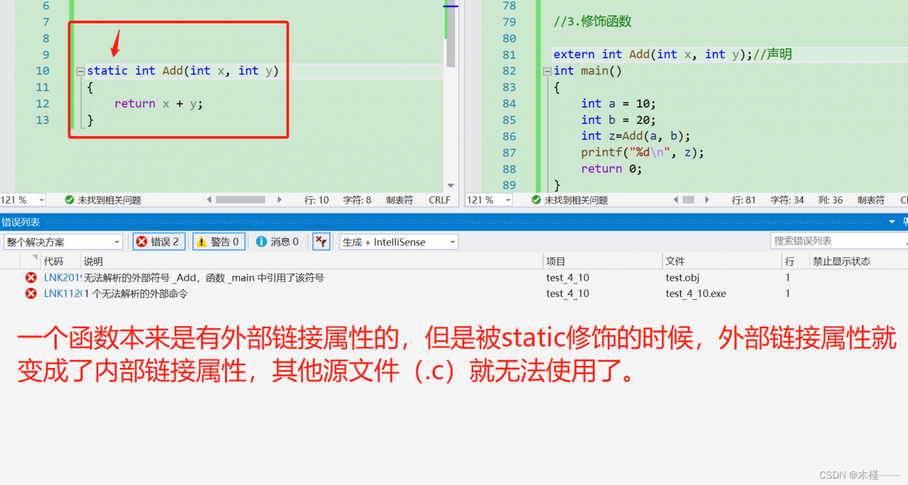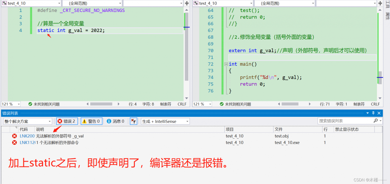 说明:static修饰全局变量的时改变了全局变量的链接属性。即static修饰全局变量的时候,这个全局变量的外部链接属性就变成了内部链接属性。其他源文件就不能再使用到这个全局变量了。