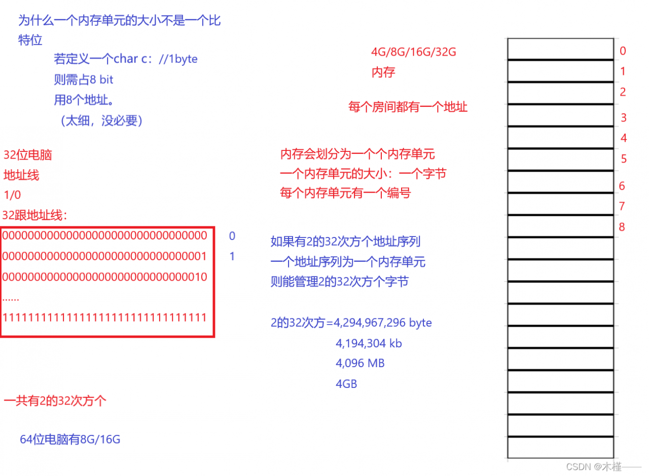 内存是电脑上特别重要的存储器,计算机中程序的运行都是在内存中进行的 。所以为了有效的使用内存,就把内存划分成一个个小的内存单元,每个内存单元的大小是1个字节。为了能够有效的访问到内存的每个单元,就给内存单元进行了编号,这些编号被称为该内存单元的地址。