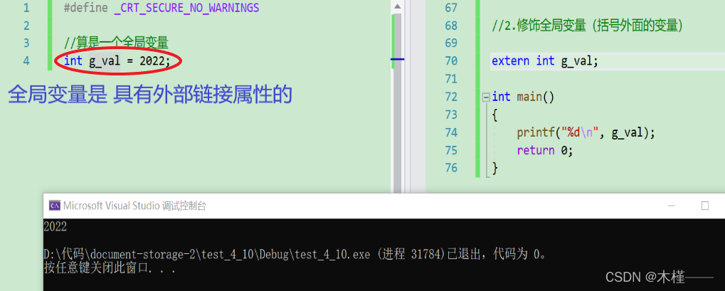 我们在使用g_val的时候,感觉它的作用域变小了,实际上上是把它的的外部链接属性变成了内部链接属性。(因为g_val是全局变量,所以它存放在静态区)