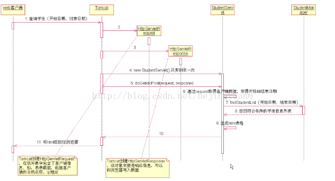 3) Servlet初始化之后,就处于响应请求的就绪状态,此时如有客户端请求发送,就会调用Servlet实例的service()方法,并且根据用户的请求方式,调用doPost或者doGet方法;