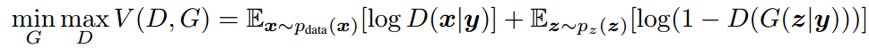 cGAN是在GAN基础上做的一种改进,通过给原始GAN的生成器和判别器添加额外的条件信息,实现条件生成模型。这是一个有监督学习,可以通过损失函数看出添加了标签条件,即通过 P ( x ∣ y ) P(x|y)P(x∣y) 与 P ( z ∣ y ) P(z|y)P(z∣y) 反求 P ( y ∣ x ) P(y|x)P(y∣x) 与 P ( z ∣ x ) P(z|x)P(z∣x)