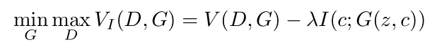 由互信息公式可知,当X与Y互相独立的时候,I = 0 I = 0I=0。如果X与Y相关程度很高的话,互信息会非常大。也就是说给定任意输入 x ∼ P G ( x ) x{\sim}P_G(x)x∼PG(x),希望生成器的 P G ( c ∣ x ) P_G(c|x)PG(c∣x) 有一个相对较小的熵,即希望隐藏编码c的信息在生成过程中不会流失,因此得到如下损失