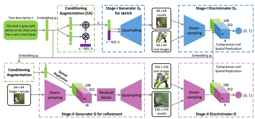 提出了 Stacked Generative Adversarial Networks (StackGAN) 结构,用于根据文字描述,生成对应的 256 * 256 的真实图像(首次这么高的分辨率)。