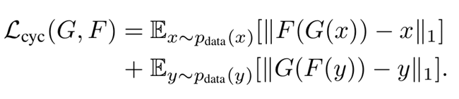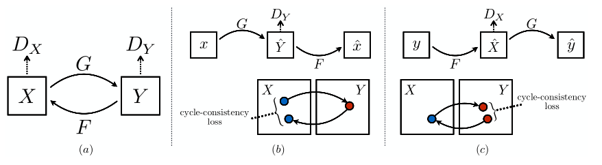 提出一种在缺少成对数据的情况下,学习从源数据域X到目标数据域Y的方法。目标是使用一个对抗损失函数,学习映射G:X → Y ,使得判别器难以区分图像 G(X)与图像Y。因为这样的映射受到巨大的限制,所以为映射G 添加了一个相反的映射F:Y → X,使他们成对,同时加入一个循环一致性损失函数 (cycle consistency loss),以确保 F(G(X)) ≈ X(反之亦然)。