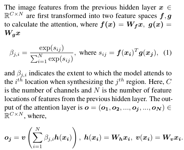 在GAN网络中,SA——Self Attention,自注意力机制,而且引入谱归一化。原论文的核心思想就在下面了,β j , i \beta_{j,i}βj,i 表示合成第 j jj 个区域时模型对第 i ii 个区域的影响程度。整体的 o ⃗ \vec oo 是注意力层,角标代表区域。