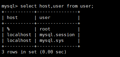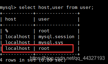 service mysqld restart执行完以后,还是不行就查看数据库的mysql里的user执行命令:select host,user from user;