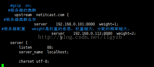 服务器准备好了,我们要在server外部定义个服务器集群,即用到了上文中提到的upstream 标签。服务器集群名字取为netitcast.com.