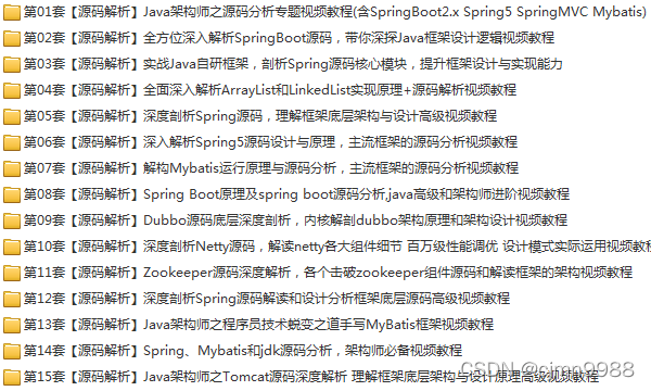 总目录:15套源码系列Spring5,Mybatis,SpringBoot,Dubbo,Netty,Zookeeper,Tomcat,SpringMVC,ArrayList,LinkedList源码深度解析,框架底层架构与源码设计原理,主流框架的源码分析,提升框架设计与实现视频教程