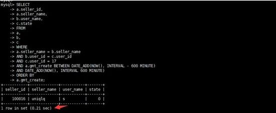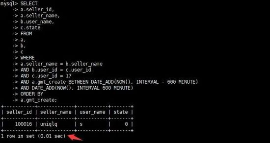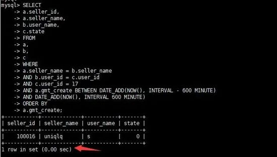 select a.seller_id,a.seller_name,b.user_name,c.statefrom a,b,cwhere a.seller_name = b.seller_nameand b.user_id = c.user_idand c.user_id = 17and a.gmt_createBETWEEN DATE_ADD(NOW(), INTERVAL – 600 MINUTE)AND DATE_ADD(NOW(), INTERVAL 600 MINUTE)order by a.gmt_create;