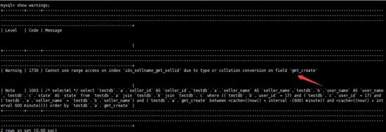 执行计划显示从全表扫描优化成了走索引,rows减少,但是此时出现了2个告警。