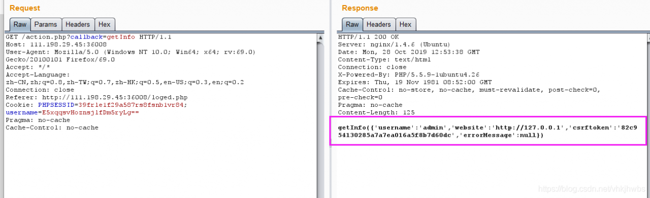 点开action.php页面 返回了 当前用户的 username 和 新生成的 csrftoken值,