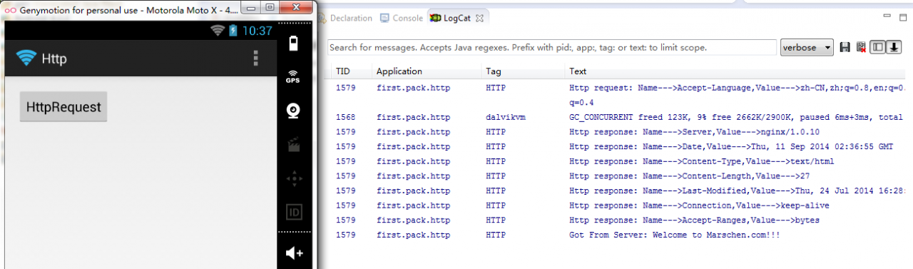 1 class NetworkThread extends Thread{ //主线程不能访问网路!!! 2 @Override 3 public void run() { 4 HttpClient httpClient = new DefaultHttpClient(); 5 HttpGet httpGet = new HttpGet("http://www.marschen.com/data1.html"); 6 //请求头是自己添加的,以键值对的形式 7 //只添加一个Accept-language作为示范, 打印时应该只是一个请求头 8 httpGet.addHeader("Accept-Language","zh-CN,zh;q=0.8,en;q=0.6,zh-TW;q=0.4"); 9 Header [] reqHeader = httpGet.getAllHeaders(); //键值对 10 for (int i = 0; i < reqHeader.length; i++) { 11 String name = reqHeader[i].getName(); 12 String value = reqHeader[i].getValue(); 13 Log.d("HTTP","Http request: Name--->" + name + ",Value--->" + value); 14 } 15 try { 16 HttpResponse resp = httpClient.execute(httpGet); 17 //响应头是服务器返回的,也是键值对形式 18 Header [] respHeader = resp.getAllHeaders(); 19 for (int i = 0; i < respHeader.length; i++) { 20 String name = respHeader[i].getName(); 21 String value = respHeader[i].getValue(); 22 Log.d("HTTP","Http response: Name--->" + name + ",Value--->" + value); 23 } 24 25 //检查相应的状态是否正常, 检查状态码是否是200 26 int code = resp.getStatusLine().getStatusCode(); 27 if(code == 200){ 28 //从相应对象中取值,得到的是流对象 29 HttpEntity entity = resp.getEntity(); 30 InputStream in = entity.getContent(); 31 BufferedReader reader = new BufferedReader(new InputStreamReader(in)); 32 String line = reader.readLine(); 33 Log.d("HTTP","Got From Server: " + line); 34 } 35 } 36 catch (Exception e) { 37 // TODO Auto-generated catch block 38 e.printStackTrace(); 39 } 40 } 41 }