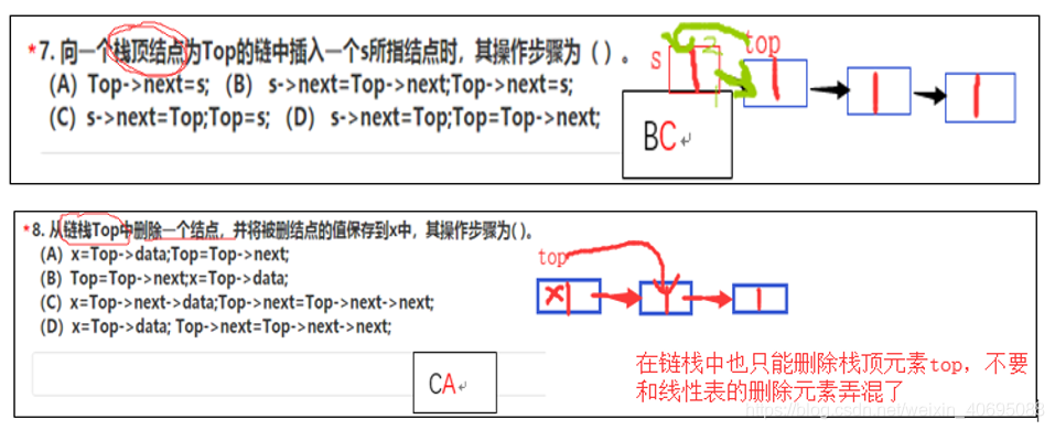 出栈 | S->top--; 直接移动top指针,不用删除原栈顶 | head->next=head->next->next; free(p);//需要释放出栈的元素