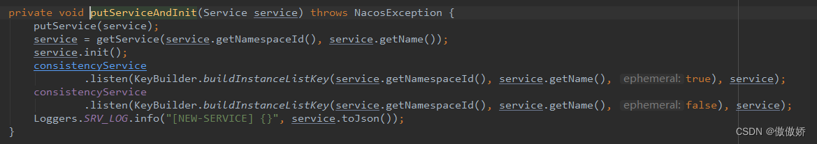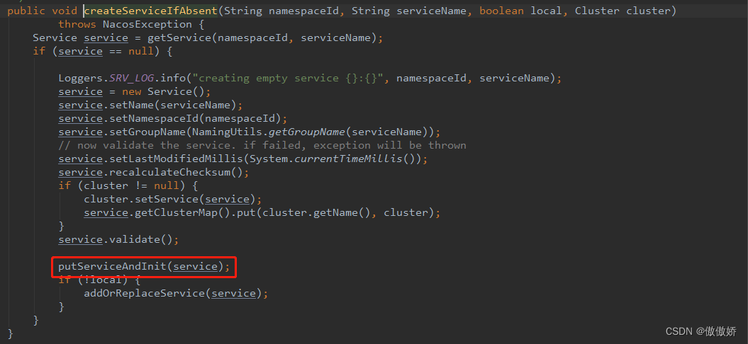 首先看第一个方法 createEmptyService,调用createServiceIfAbsent,如果service不存在,则创建一个,并初始化,调用putServiceAndInit