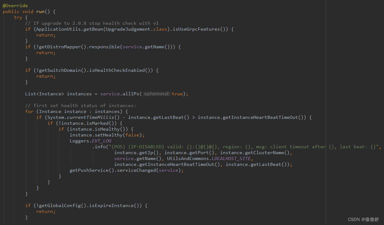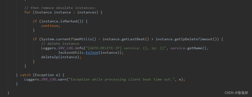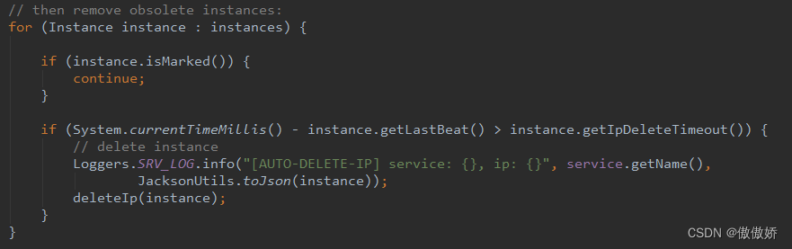 第三遍历所有实例,如果系统时间减去上次心跳时间大于30秒,则删除这个实例。